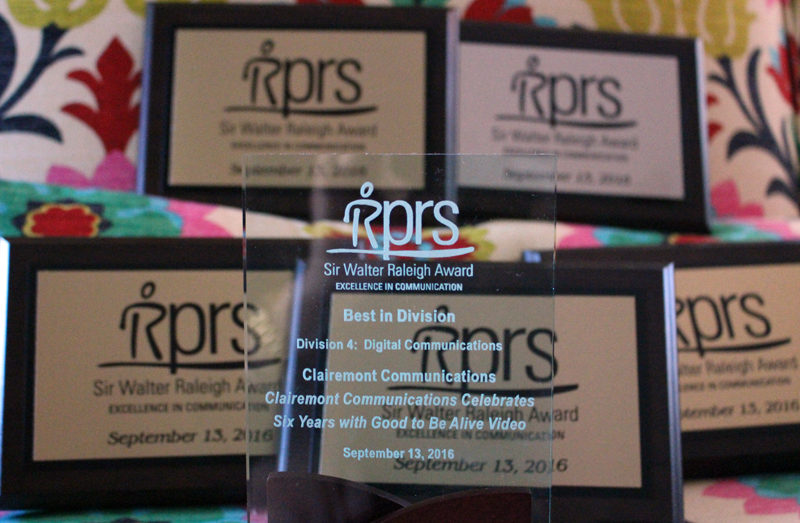 On October 11, 2016, the Raleigh Public Relations Society (RPRS) honored Clairemont Communications at the annual Sir Walter Raleigh Awards Banquet with accolades recognizing outstanding public relations campaigns. Clairemont was honored for client work in promotional campaigns, event planning, marketing strategies, industry writing and digital communications.