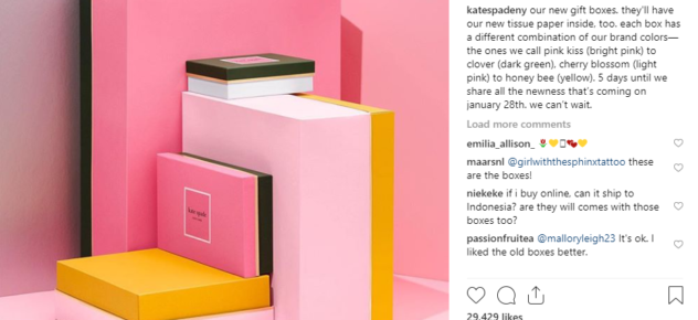 Kate Spade: In a follow-up post, the brand captioned, “Our new gift boxes. They’ll have our new tissue paper inside, too. Each box has a different combination of our brand colors—the ones we call pink kiss (bright pink) to clover (dark green), cherry blossom (light pink) to honey bee (yellow). 5 days until we share all the newness that’s coming on January 28th. We can’t wait.”
