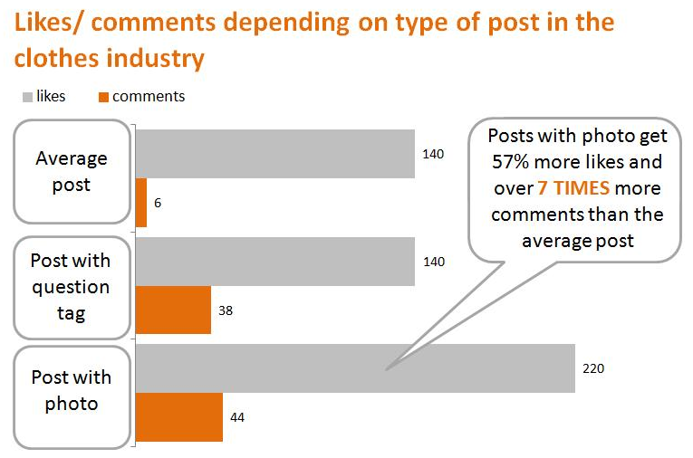 Photos > Words. Witty prose and insightful questions won’t cut it when it comes to engaging fans. Posts with photos garner more fan comments than posts simply asking a question. Follow the example of clothing store Topshop. In this study, only the brand’s 25th most popular post even contained words.