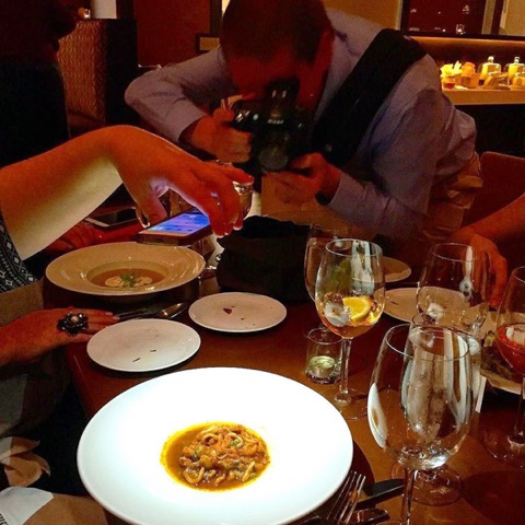 Ever wonder how foodies take such fabulous photos of mouth-watering, scrumptious-looking plates? In this case, a little teamwork makes the dream work. Check out Trish Witek’s photo of food bloggers collaborating on how to get the best shot at Il Palio’s (client) VIP foodie dinner. As one food blogger shines an iPhone flashlight onto the dish, another friend zooms in on his camera for the perfect (well-lit!) shot.