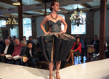 To make this dress Anna Beth used laser etching, rust dyeing on the denim fabric and nuts and bolts for embellishment. She used more than 10 yards of denim to create this gorgeous piece — and it weighed several pounds!