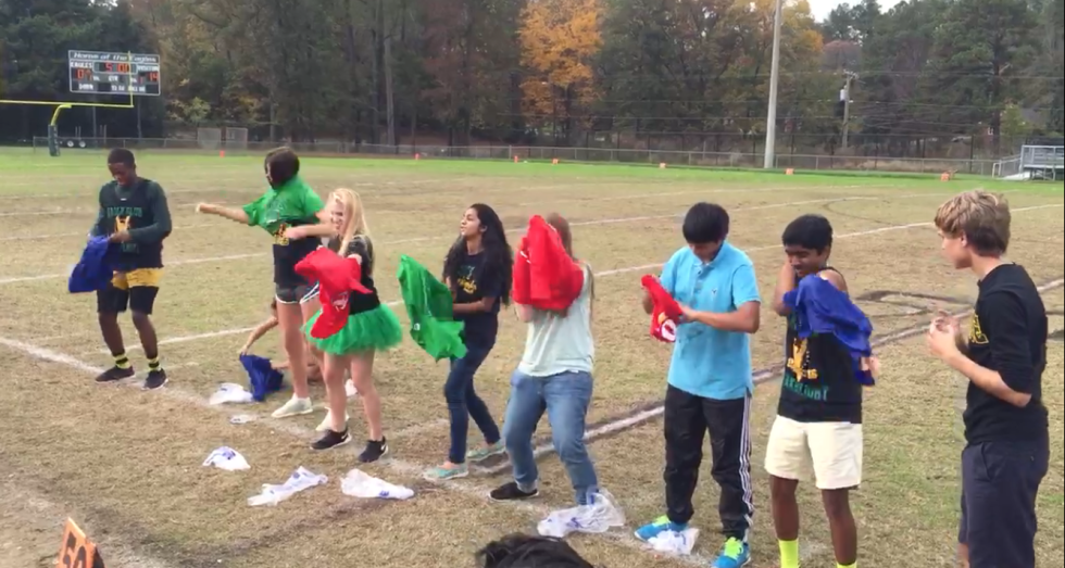 Each student was given a t-shirt that had been soaked in water, rolled up, placed in a plastic bag and put into a freezer overnight. The challenge was to unroll the frozen t-shirt and put it on in the fastest time. The prize? A year’s worth of free Blizzards from Triangle Dairy Queen.
